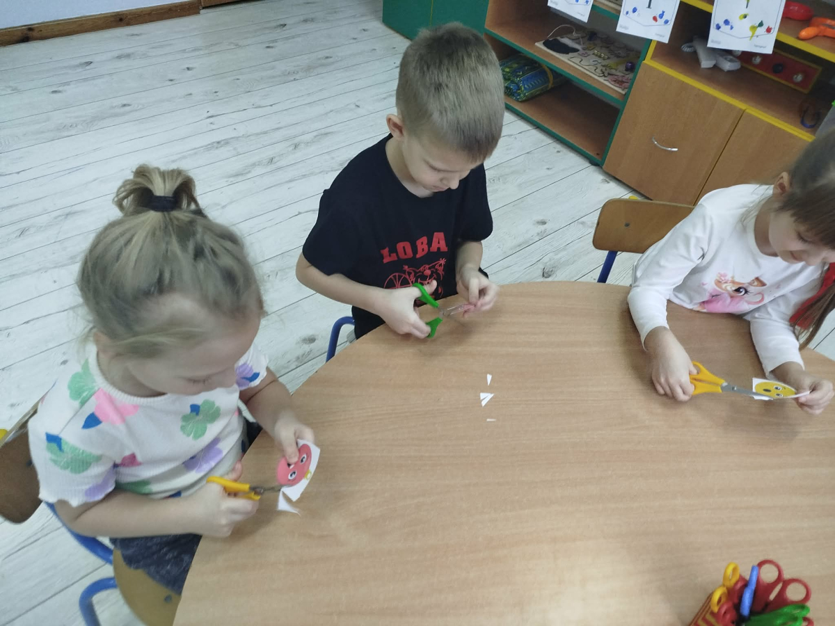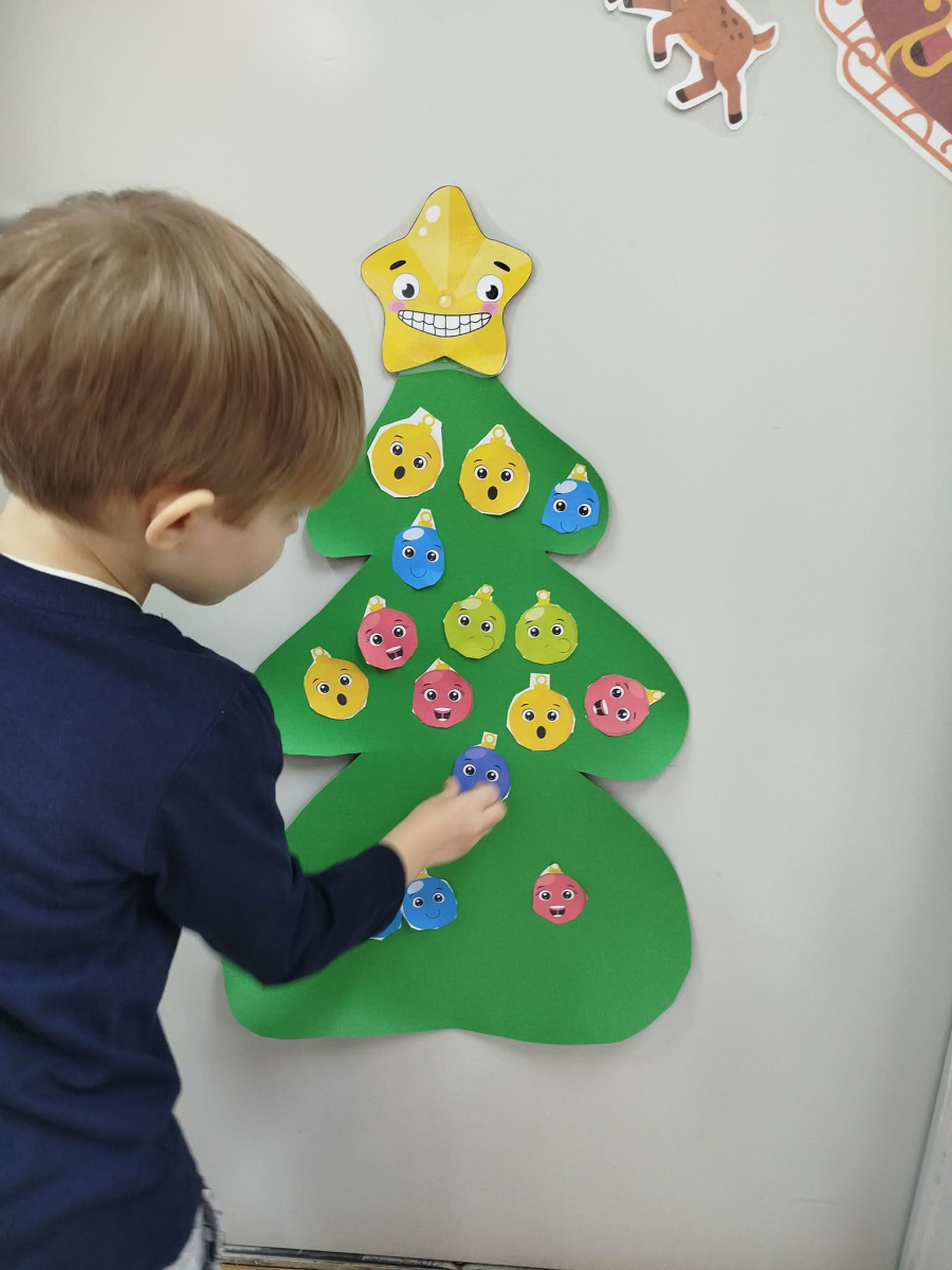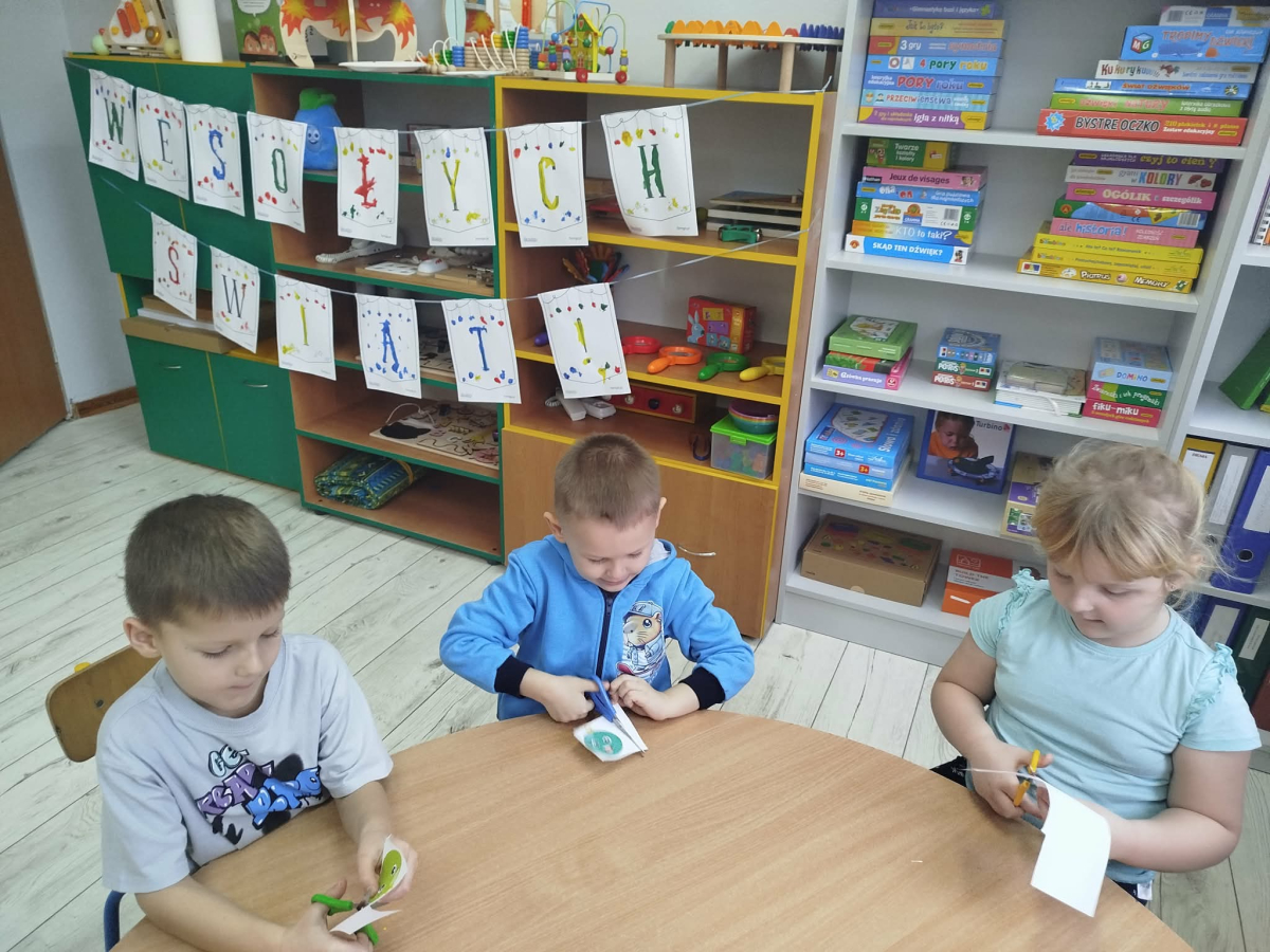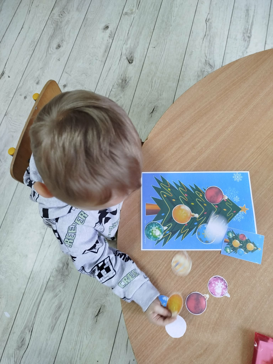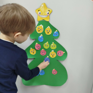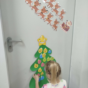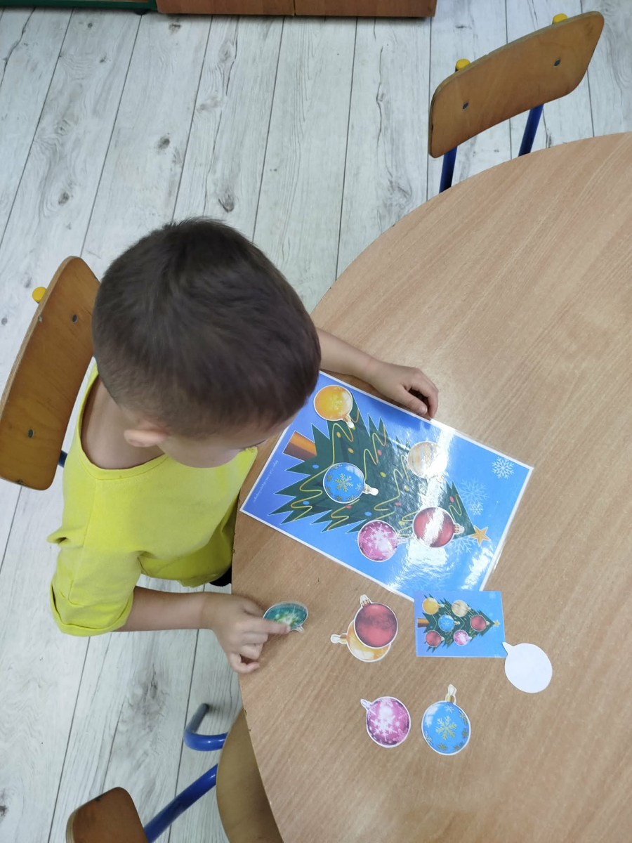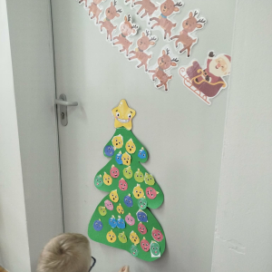 W ostatnich dniach, przed Świętami Bożego Narodzenia, podczas zajęć logopedycznych przedszkolaki dekorowały salę logopedyczną. Dzieci usprawniały narządy artykulacyjne z obrazkami przedstawiającymi bombki choinkowe. Ćwiczyły percepcję wzrokową, nazwy kolorów i spostrzegawczość. Usprawniały motorykę małą – wycinając bombki z papieru kolorowego. Na zakończenie odbyła się zabawa – malowanie palcami napisu „WESOŁYCH ŚWIĄT”.