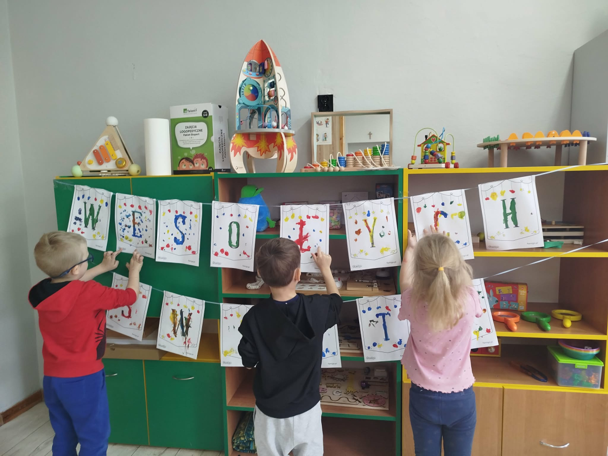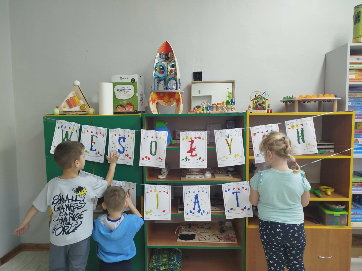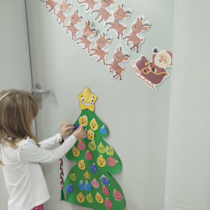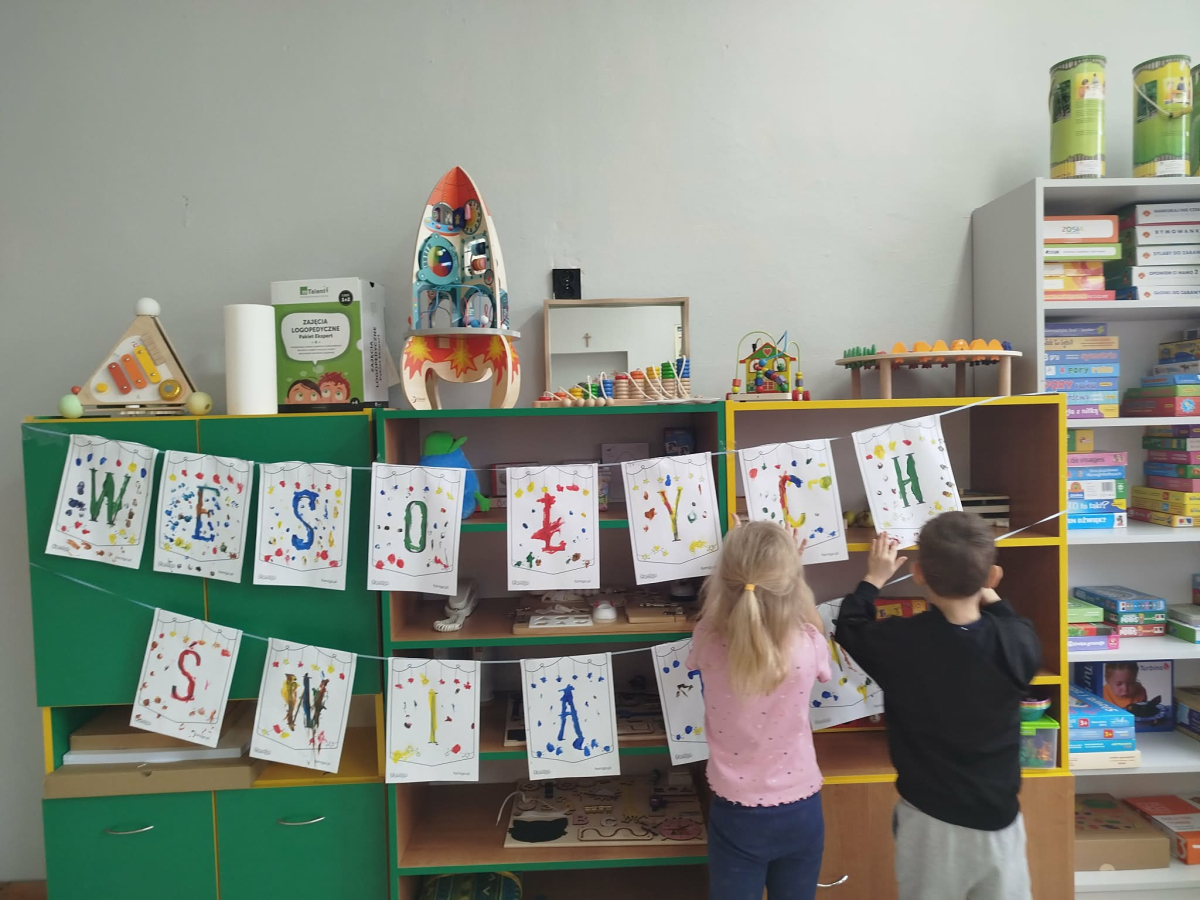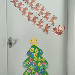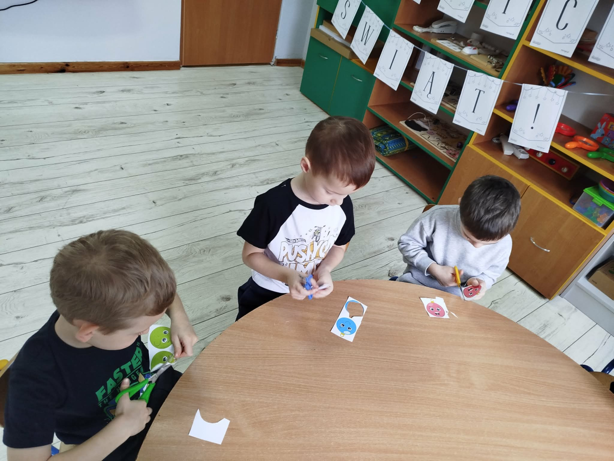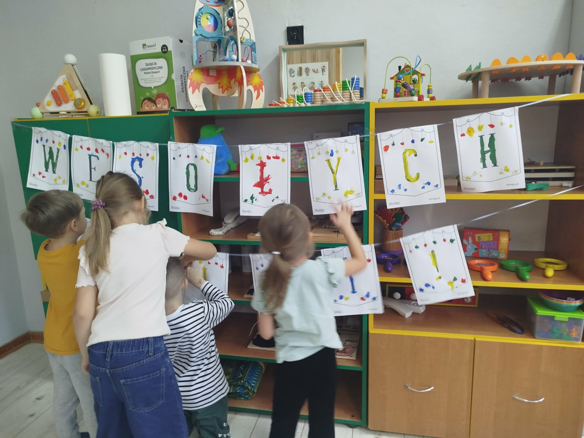 W ostatnich dniach, przed Świętami Bożego Narodzenia, podczas zajęć logopedycznych przedszkolaki dekorowały salę logopedyczną. Dzieci usprawniały narządy artykulacyjne z obrazkami przedstawiającymi bombki choinkowe. Ćwiczyły percepcję wzrokową, nazwy kolorów i spostrzegawczość. Usprawniały motorykę małą – wycinając bombki z papieru kolorowego. Na zakończenie odbyła się zabawa – malowanie palcami napisu „WESOŁYCH ŚWIĄT”.
