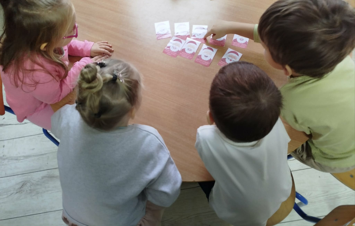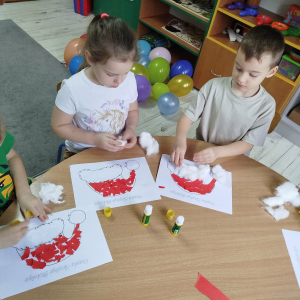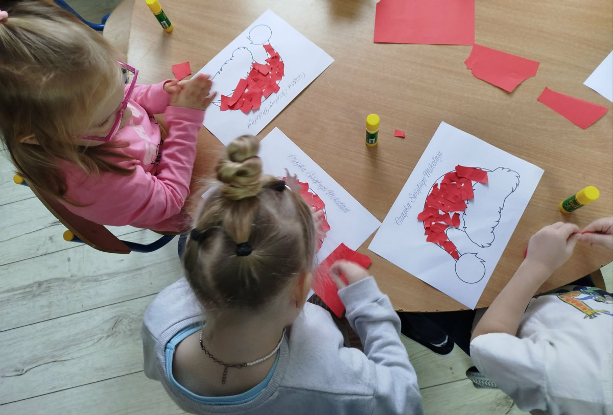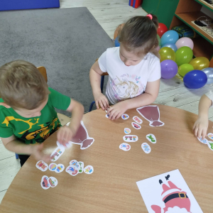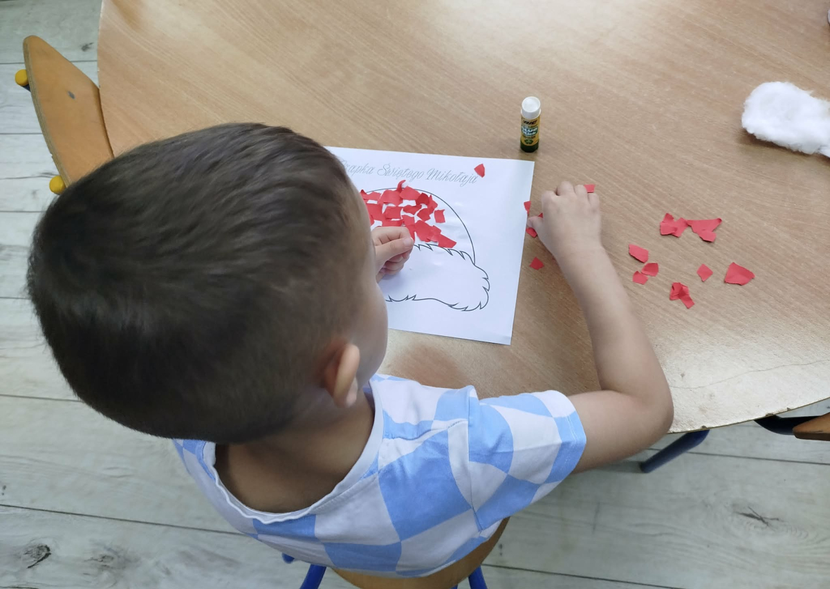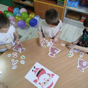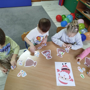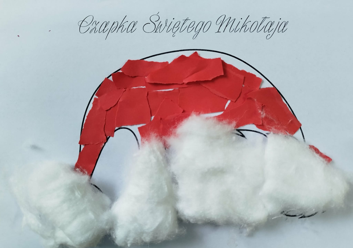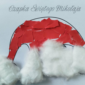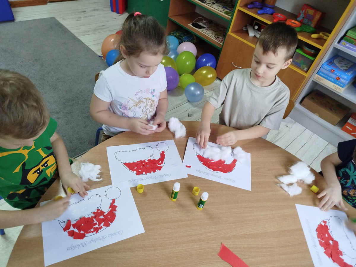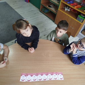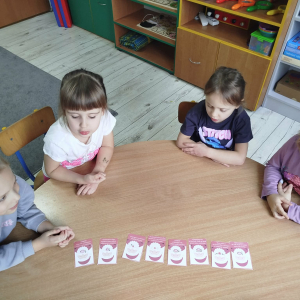 W czasie naszych zajęć dzieci usprawniały narządy artykulacyjne z obrazkami przedstawiającymi Mikołaja. Przedszkolaki ćwiczyły percepcję słuchową - miały układać na worku Mikołaja prezenty w odpowiedniej kolejności. Liczyły na materiale konkretnym. Wykonały pracę plastyczną „Czapka Mikołaja”.