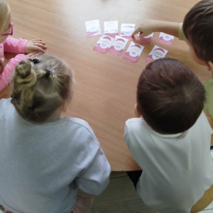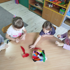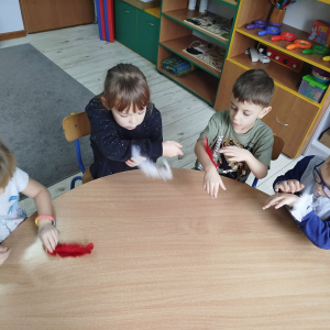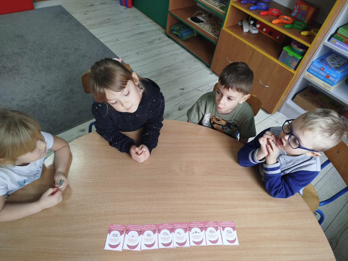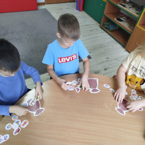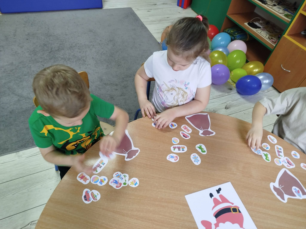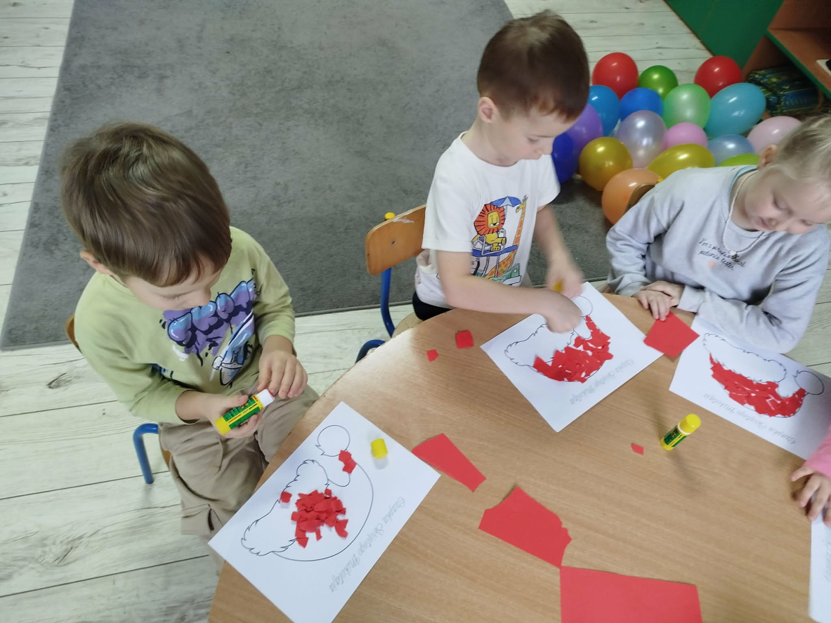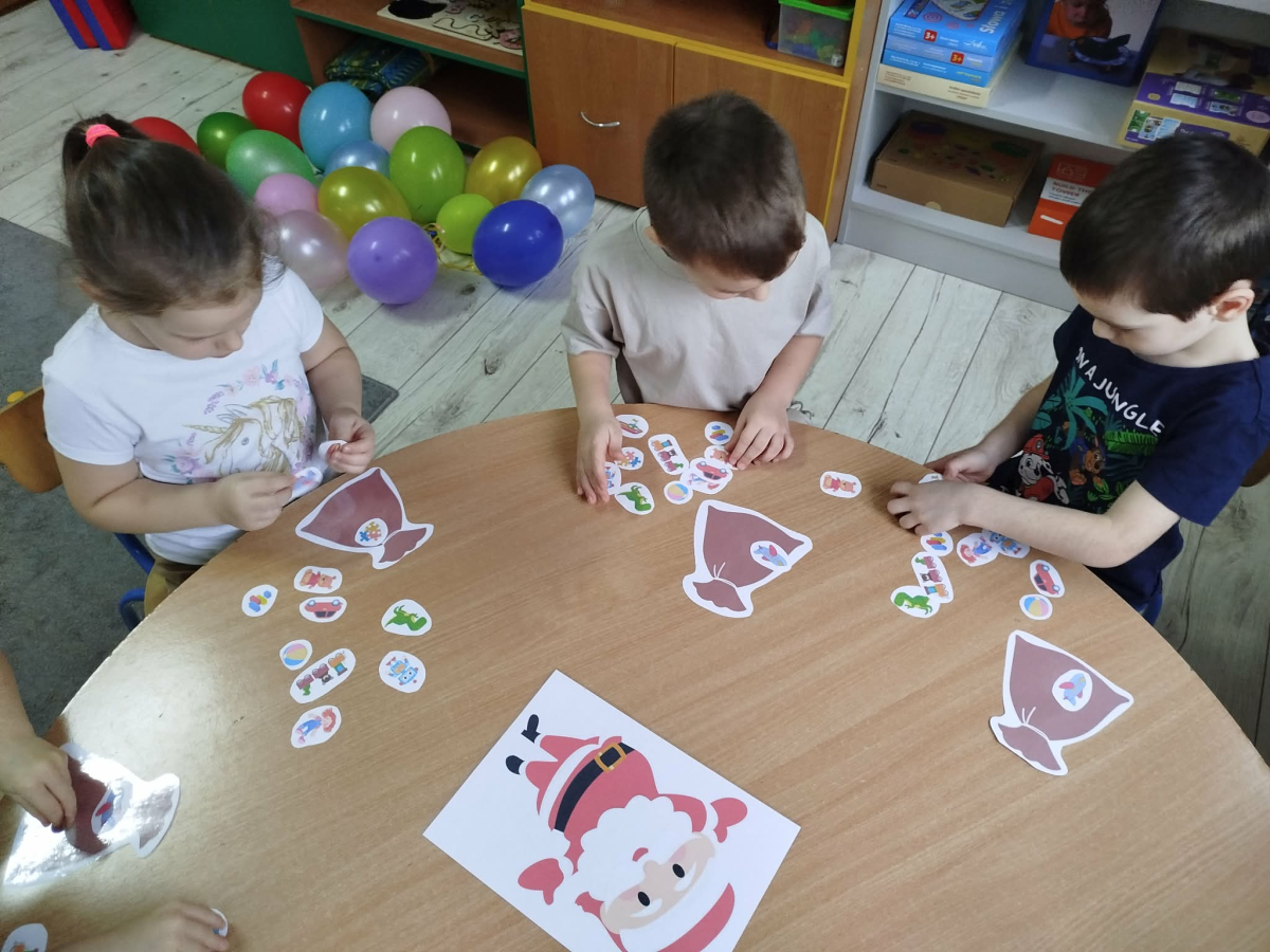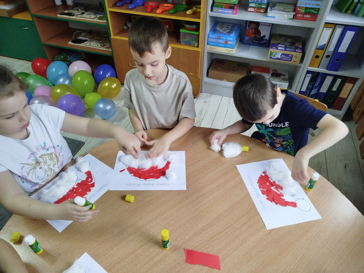 W czasie naszych zajęć dzieci usprawniały narządy artykulacyjne z obrazkami przedstawiającymi Mikołaja. Przedszkolaki ćwiczyły percepcję słuchową - miały układać na worku Mikołaja prezenty w odpowiedniej kolejności. Liczyły na materiale konkretnym. Wykonały pracę plastyczną „Czapka Mikołaja”.