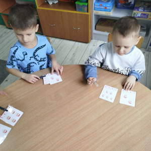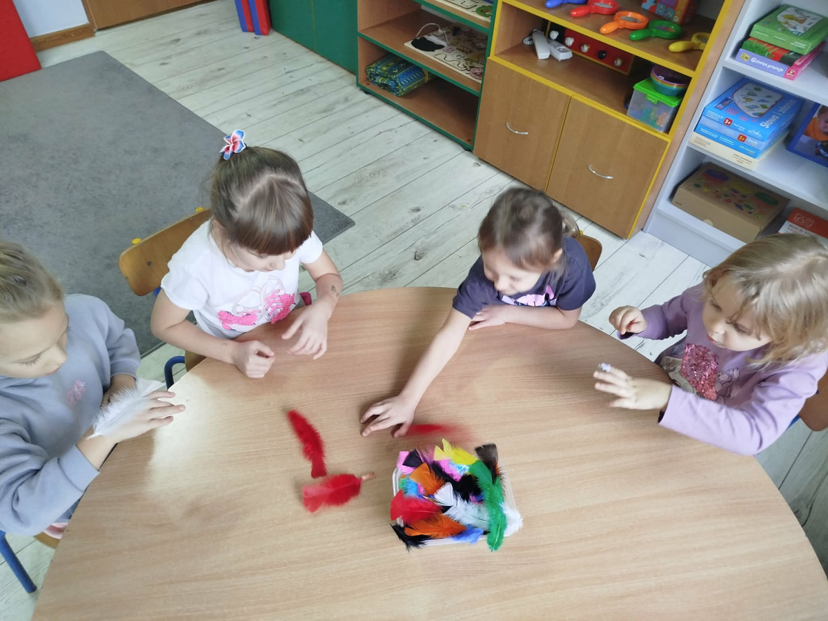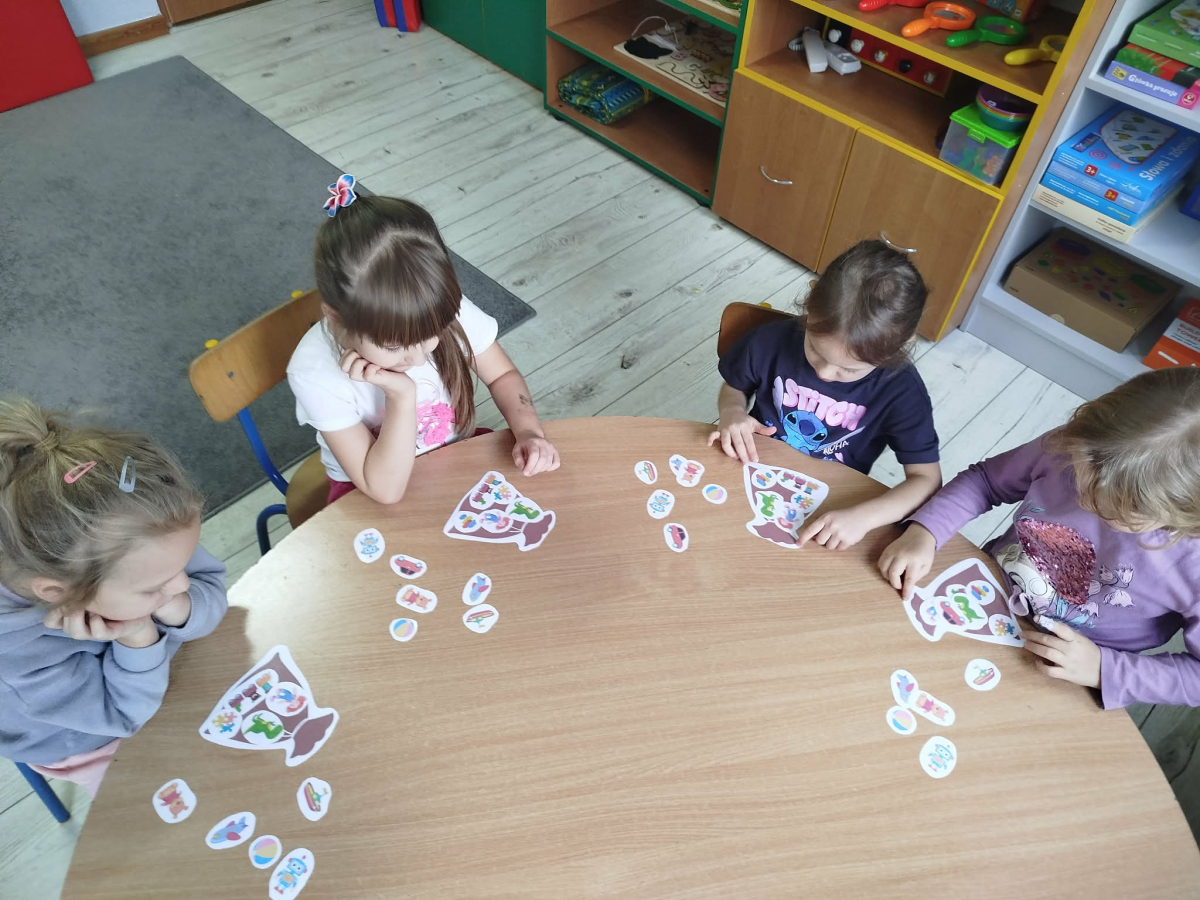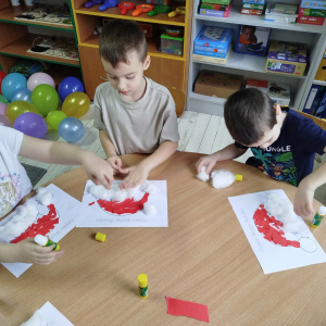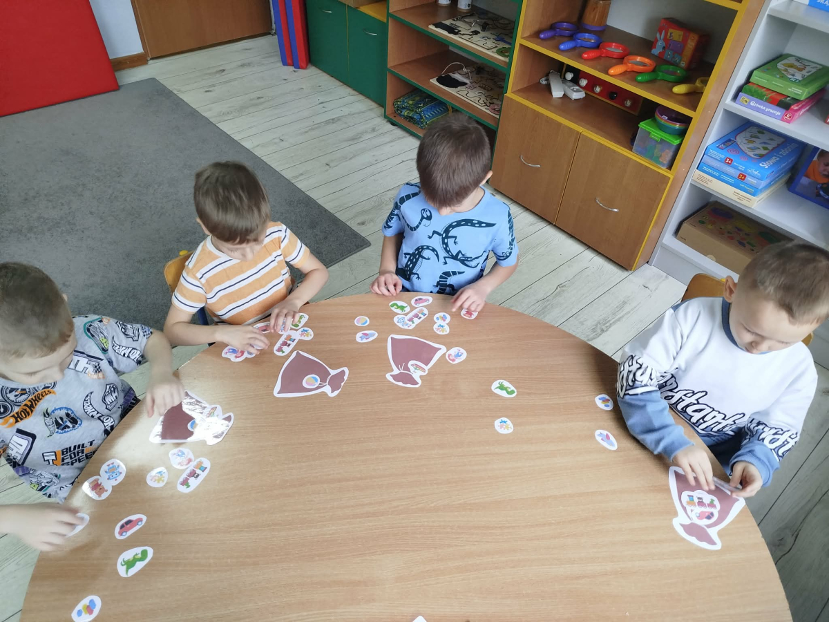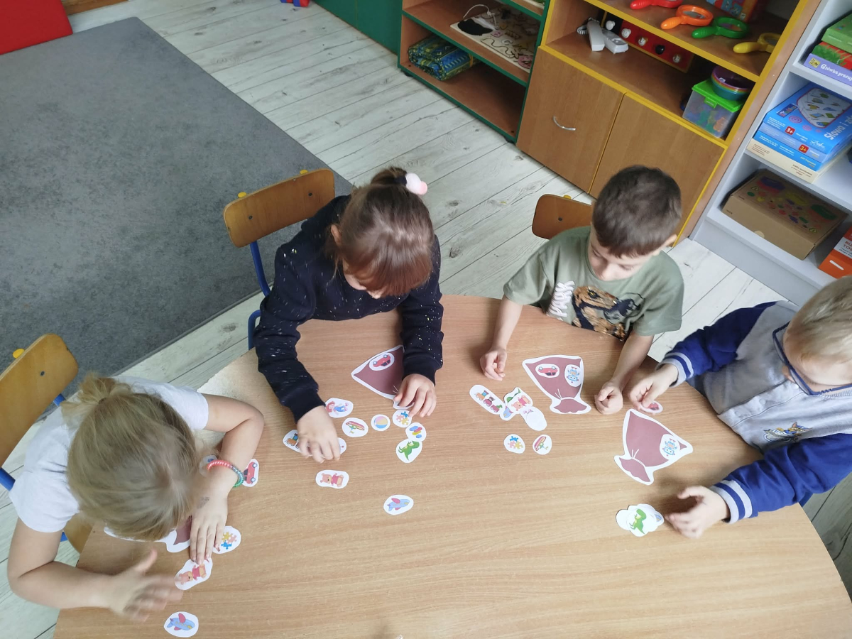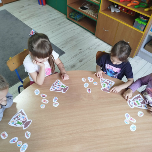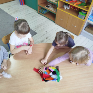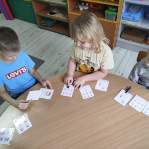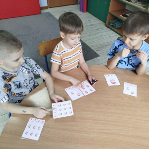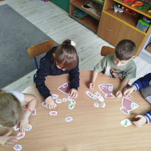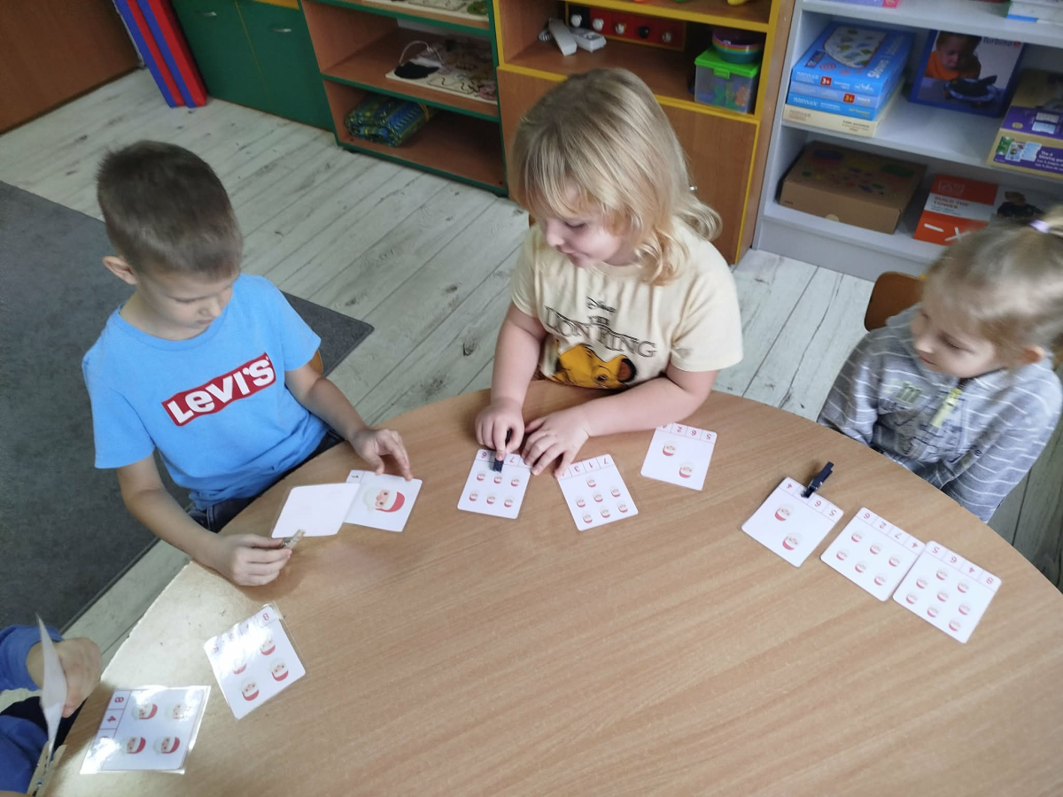 W czasie naszych zajęć dzieci usprawniały narządy artykulacyjne z obrazkami przedstawiającymi Mikołaja. Przedszkolaki ćwiczyły percepcję słuchową - miały układać na worku Mikołaja prezenty w odpowiedniej kolejności. Liczyły na materiale konkretnym. Wykonały pracę plastyczną „Czapka Mikołaja”.